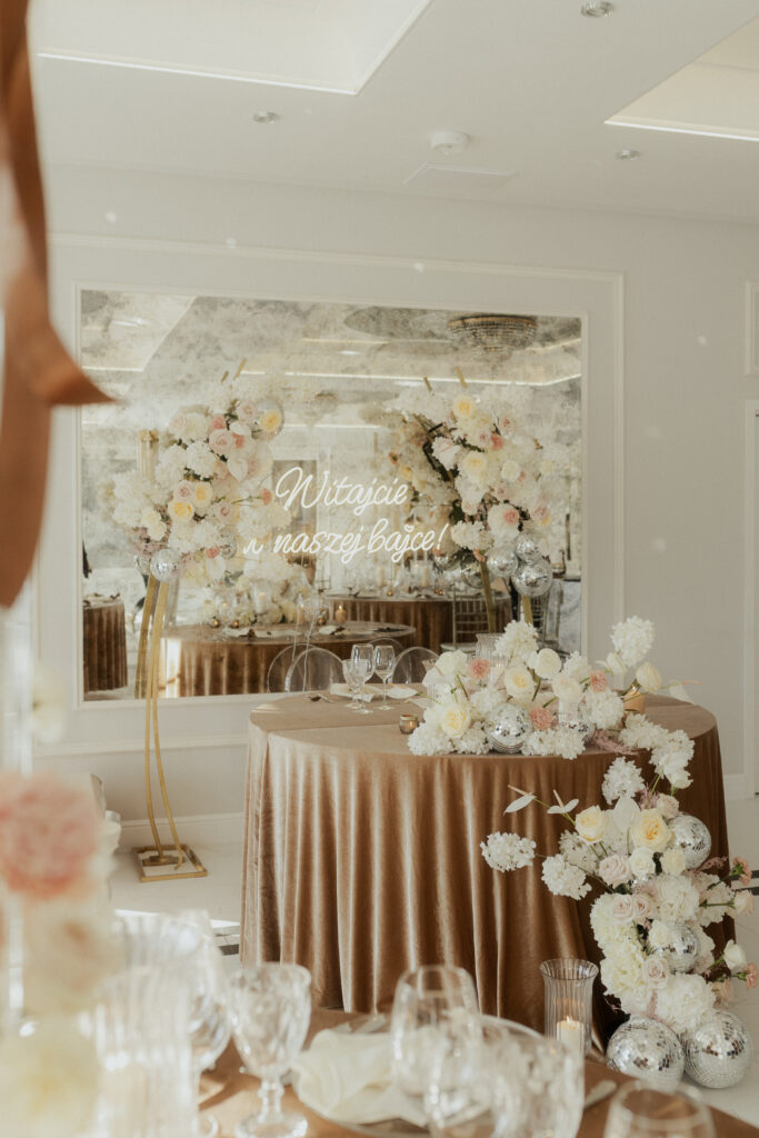 Przy ceremonii (kościół lub plener) postaw na elementy, które dobrze wyglądają na zdjęciach: tło do przysięgi/łuk, delikatną alejkę, kompozycje przy wejściu i przy ołtarzu. W sali z kolei liczy się rytm: powtarzalne kompozycje na stołach, świece i drobne detale, które budują klimat wieczorem. Jeśli planujesz ściankę kwiatową albo tło do zdjęć, najlepiej spiąć je stylistycznie z tym, co dzieje się na stołach — wtedy całość wygląda luksusowo i naturalnie.