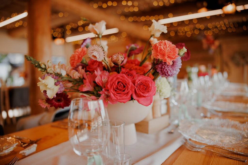 Warto dopasować dekoracje do miejsca. Inaczej pracuje się w nowoczesnej sali z dużą ilością światła, a inaczej w klimatycznym wnętrzu z cegłą czy drewnem. Czasem wystarczy kilka mocniejszych punktów: dekoracja stołu Pary Młodej, spójne kompozycje na stołach i detal w strefie wejścia. Reszta może być lżejsza — ważne, żeby kierunek był ten sam.